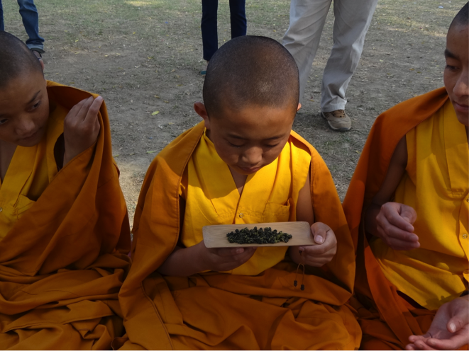 這一段路並不好爬,尤其背上擔負著沈重的茶具,爬上這光凸凸的山頭確實費力。一直以為「慢.茶之旅」的第一場供佛茶席會在正覺塔,沒想到竟然會是在佛陀曾經苦修的蘇嘉達牧羊女之村,而第二場也遠在離菩提迦耶好幾公里處的龍洞。